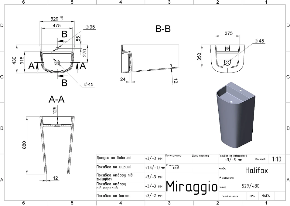 Раковина для ванной Miraggio HALIFAX MATT напольная 53х43 см Miramarble белый матовый 0000533