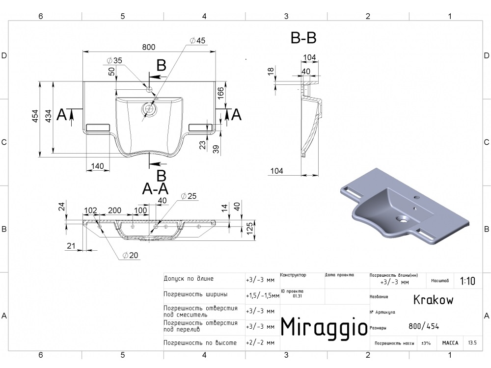 1) Раковина для ванной Miraggio Krakow подвесная с отверстием под смеситель белый глянцевый