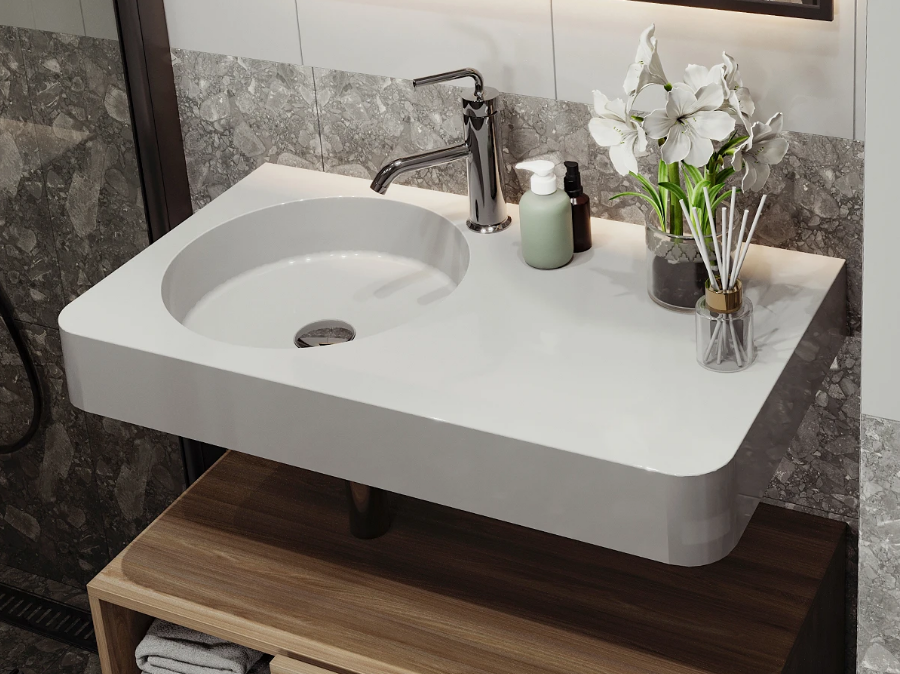 Литой мрамор отличается способностью поглощать звуки воды и принимать температуру окружающей среды. Благодаря этому умывальник из литого мрамора бесшумный, удобный и надежный. Он устойчив к температурным перепадам, загрязнениям и царапинам. Оптимальный температурный диапазон эксплуатации изделия от -65 до +65 °C.