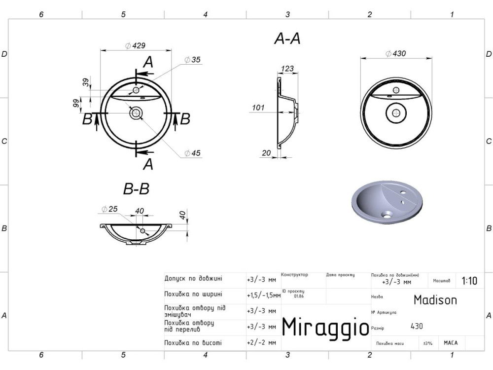 MIRAGGIO – украинский бренд, более 10 лет специализирующийся на изготовлении сантехники из литого мрамора. Компания имеет собственное производство в г. Днепр. Для производства сантехники мы используем оборудование, разработанное нашими инженерами. У приборов и форм MIRAGGIO нет аналогов в мире. Важно, что у каждой формы дубликат, что гарантирует непрерывный процесс производства умывальников и ванн.