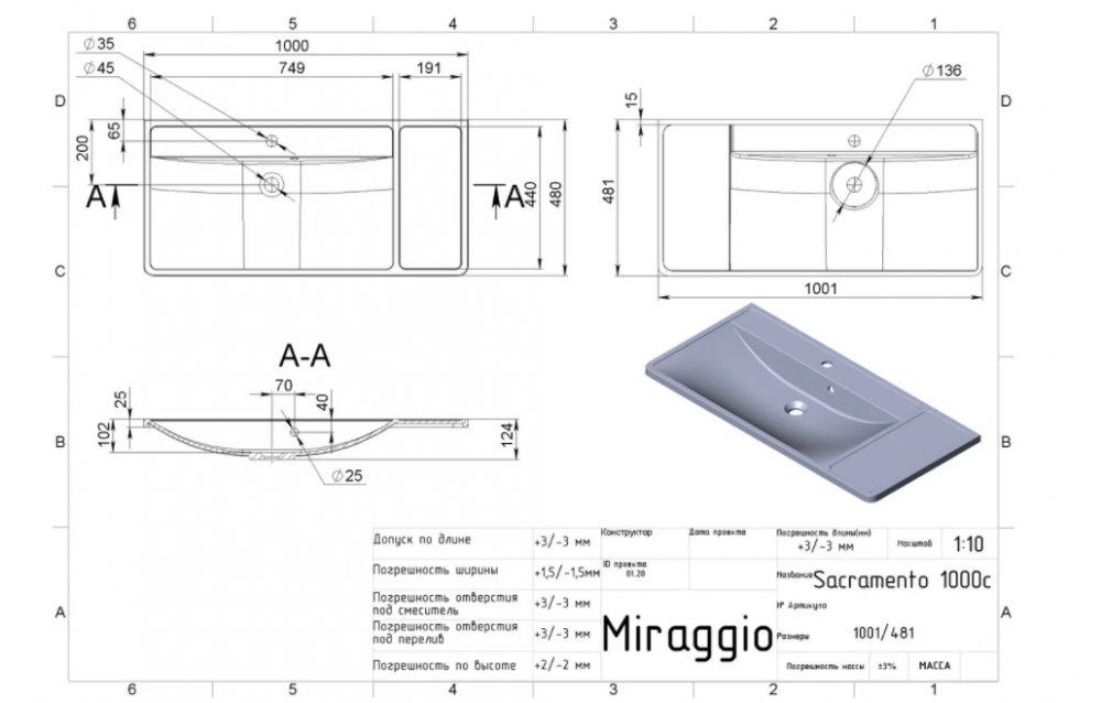 1) Раковина для ванной Miraggio Sacramento 1000 врезная с отверстием под смеситель белый матовый