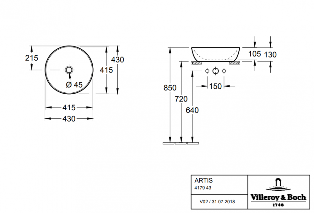 Раковина для ванной накладная Villeroy&Boch ARTIS 43 см без отв. под смеситель альпин-белый 417943R1
