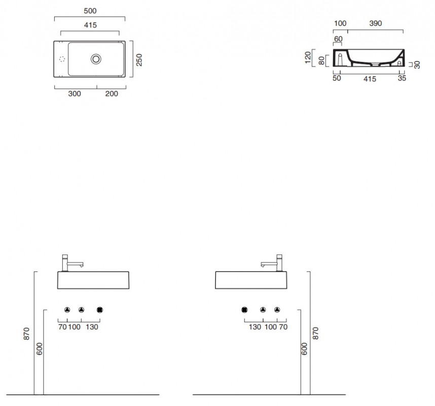 Раковина Catalano New Zero имеет полувстраемую установку, на столешнице или на колонне. Предусмотрено несколько различных положений смесителей на поверхности или встроенные в стену. Дополнительно можно приобрести полотенцедержатель из хромированного металла.