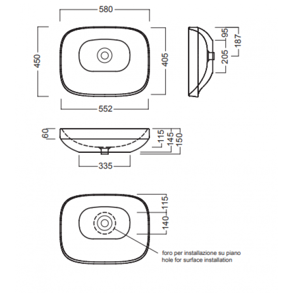Раковина накладная HATRIA ABITO A0YXXA, без отверстий для смесителя, без перелива, размер 58x45 см, цвет черный матовый. Донный клапан и сифон приобретаются отдельно.