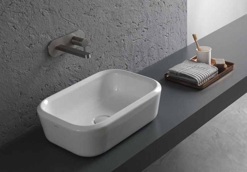 Раковина накладная HATRIA PENCIL Y1GF01, без отверстий для смесителя, без перелива, размер 55x38 см, цвет белый.