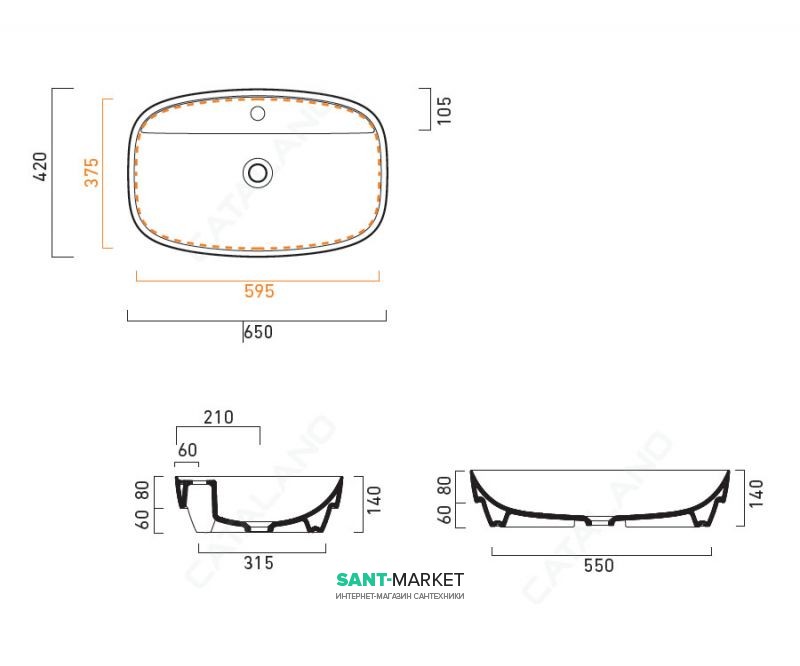 Раковина для ванной настольная или полувстраиваемая Catalano Green LUX 65х42 см 1 отв. под смеситель белая 165GRLX00
