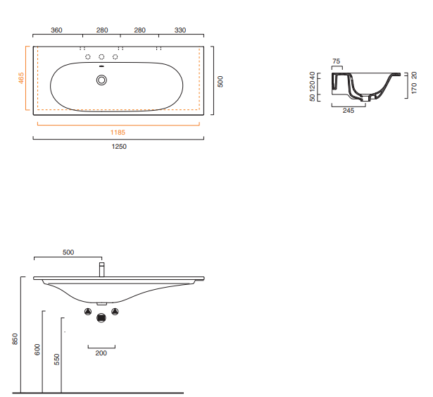 1) Раковина для ванной подвесная Catalano Impronta 125х50 керамика цвет белый