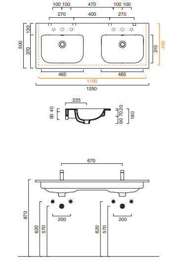 1) Раковина для ванной подвесная двойная прямоугольная Catalano Sfera 125х50 керамика цвет белый
