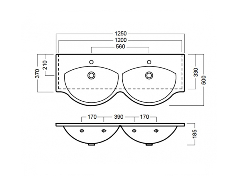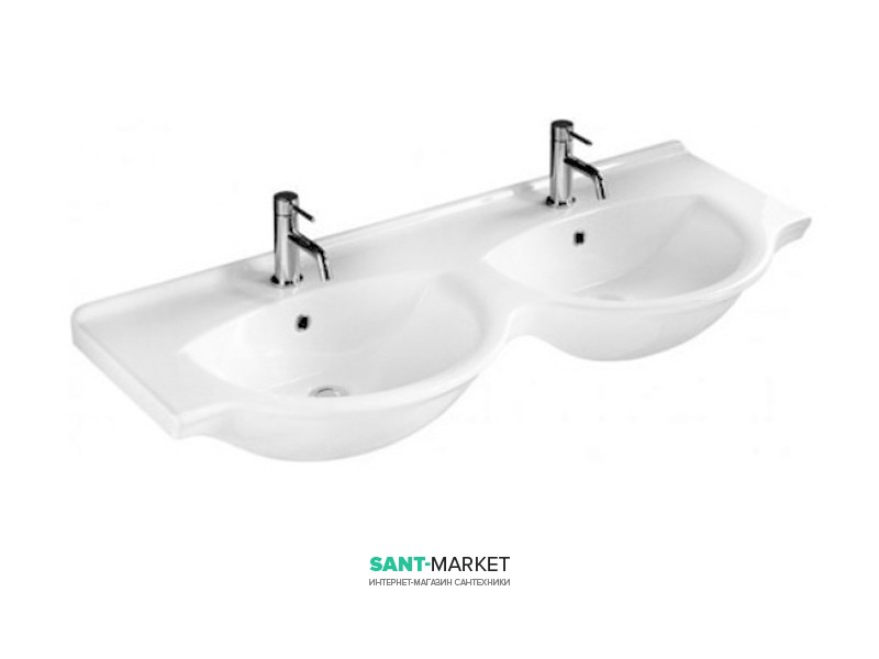 Раковина двойная подвесная HATRIA SOPHIE Y0Q501, размер 125х50 см, цвет белый. Раковина с двумя центральными отверстиями под смеситель, с отверстиями перелива; крепежные элементы приобретаются отдельно. Монтируется на стену, или мебель.
