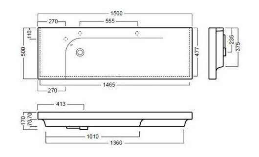 Раковина подвесная HATRIA GRANDANGOLO YXF301 с 1 отверстием для смесителя (еще 2 отверстия намечены), размер 150х50 см, цвет белый. Устанавливается также на тумбе или в сочетании с тумбой SLIDING Wood System. Комбинируются с керамическими правыми и левыми полками Grandangolo 50, вешалками для полотенец и сифоном.