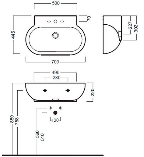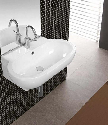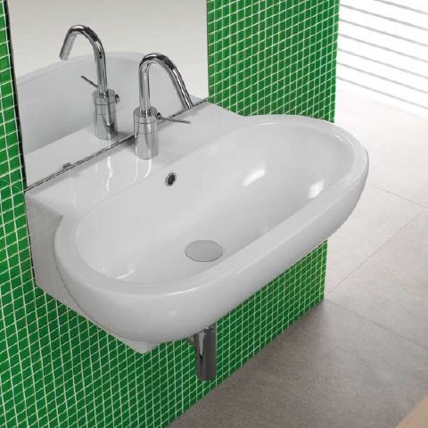 Настенная керамическая раковина 70,3х44,5 см с переливным отверстием и одним отверстием для смесителя (ещё подготовлены два дополнительных отверстия для смесителя, устанавливающегося на три отверстия).
