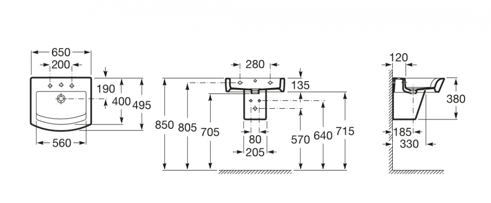1) Раковина для ванной подвесная Roca Hall 65х49.5 с одним отверстием под смеситель керамика белая