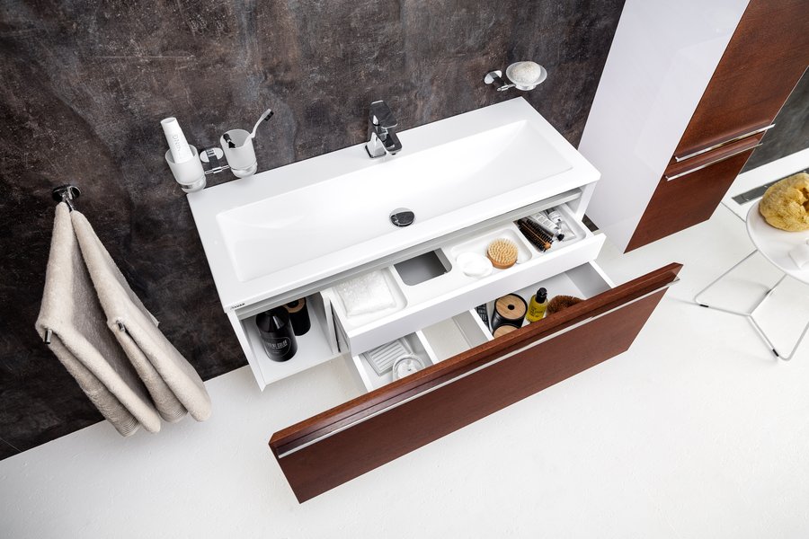 Умывальники Clear плывут на волне последних тенденций горизонтальных линий, которые простираются по стенам ванной комнаты и оставляют в ней воздушное и свободное внутреннее пространство. Продольная ориентация увеличивает комфорт во время мытья, для Ваших рук включая локти всегда достаточно свободного места.