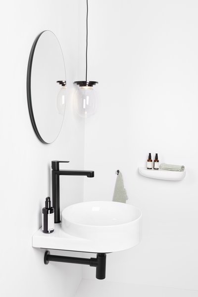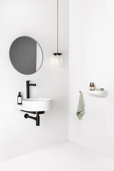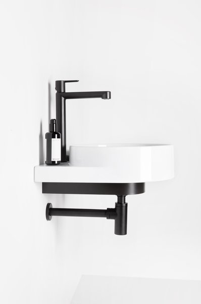 Круглая раковина дополняется элементом дизайна в виде кронштейна белого цвета, черного или из нержавеющей стали. Магия элегантности объединяет в один тон сочетание кронштейна, смесителя, сифона и слива.