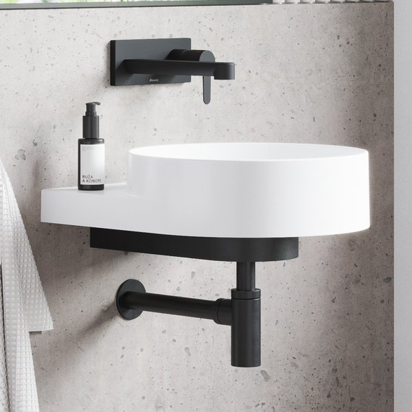 Круглая раковина дополняется элементом дизайна в виде кронштейна белого цвета, черного или из нержавеющей стали. Магия элегантности объединяет в один тон сочетание кронштейна, смесителя, сифона и слива.