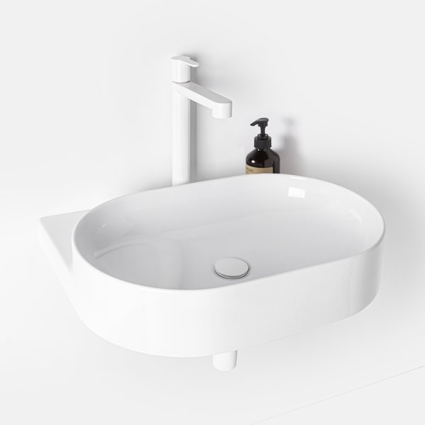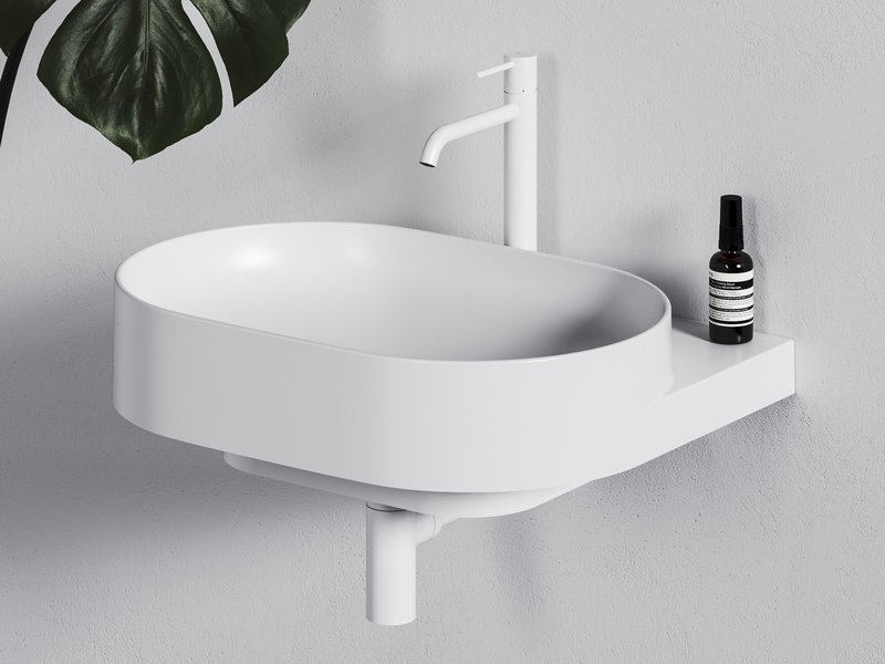 Овальная раковина дополняется элементом дизайна в виде кронштейна белого цвета, черного или из нержавеющей стали. Магия элегантности объединяет в один тон сочетание кронштейна, смесителя, сифона и слива.