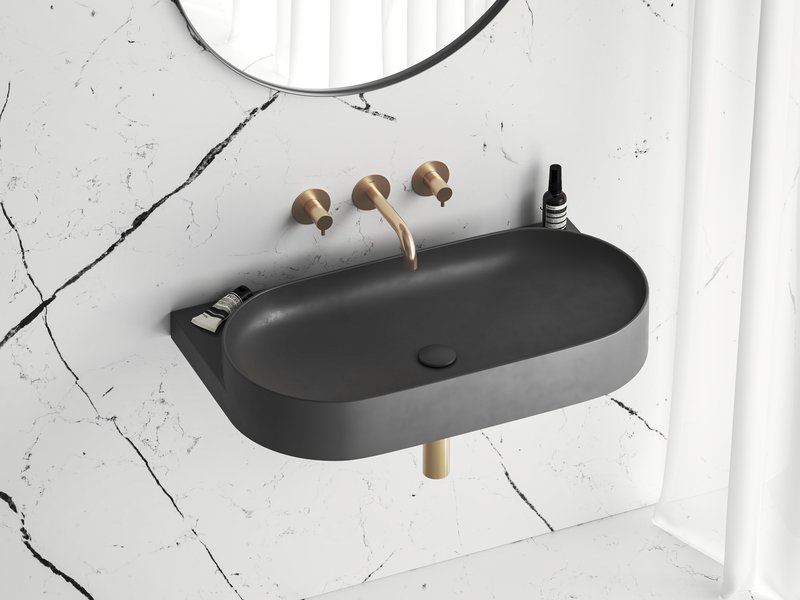 Все, что вам нужно, находится в пределах досягаемости, но умело спрятано за краем умывальника. Щетки, диспенсеры и другие мелкие предметы так легко исчезают и не нарушают эстетического впечатления от ванной комнаты. Кроме того, предметы никогда не будут падать в умывальник.