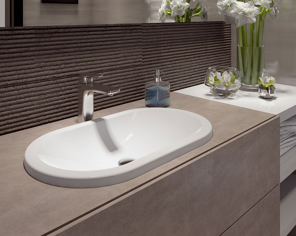 Овальные изгибы раковины «Гера» способны привнести в атмосферу санузла ноток мягкости и спокойствия, позволяя сантехнике гармонично вписаться в интерьер, выполненный в классическом или современном стиле. Это роскошный вариант для элитного интерьера, врезной умывальник «Гера» изысканно смотрятся в ванной комнате, выполняет эстетическую функцию, выступая нарядным украшением интерьера. Обрамляющая чашу просторная столешница увеличивает рабочее пространство, а полочки расположенной под раковиной тумбочки или шкафа легко умещают предметы личной гигиены и моющие средства. Устанавливается умывальник в столешницу самостоятельно или же в паре. Это придаст вашей ванной комнате ещё больше роскоши и красоты, а главное- удобство использования двух умывальников одновременно.