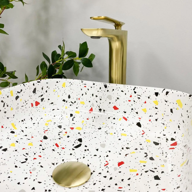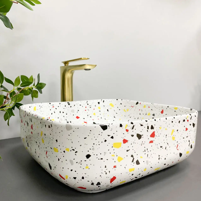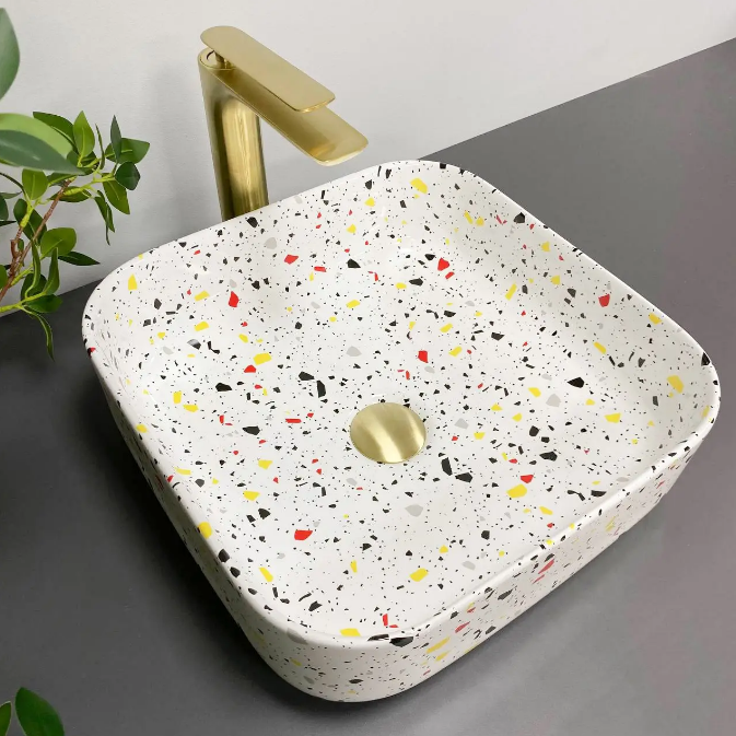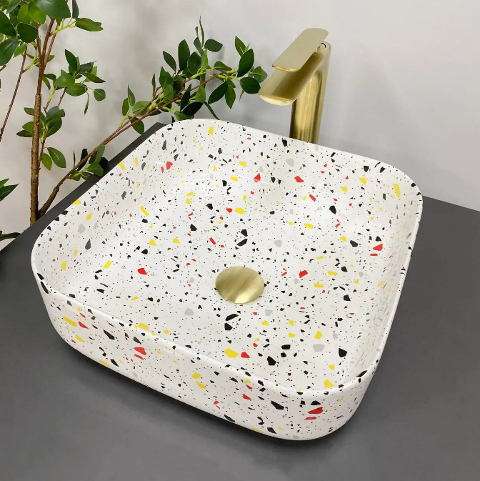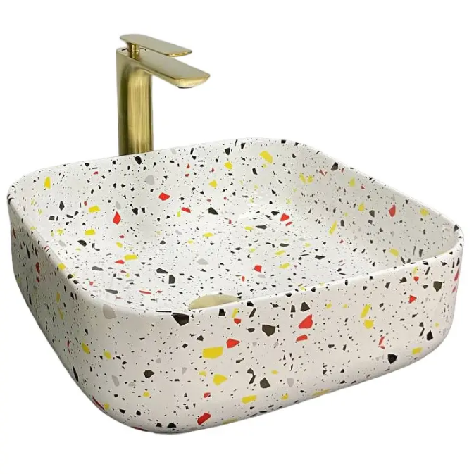 Накладные раковины серии VBI ALGHERO пользуются высоким спросом и доступны в разных цветах в матовом и глянцевом исполнении. Раковина имеет невероятную квадратную форму с закруглениями. Накладная по способу установки раковина изготовлена из высококачественной керамики. Модель VBI ALGHERO TERAZZO имеет уникальный узор. В основе есть белый цвет, украшенный хаотическими, цветными пятнышками это придает раковине яркий характер.