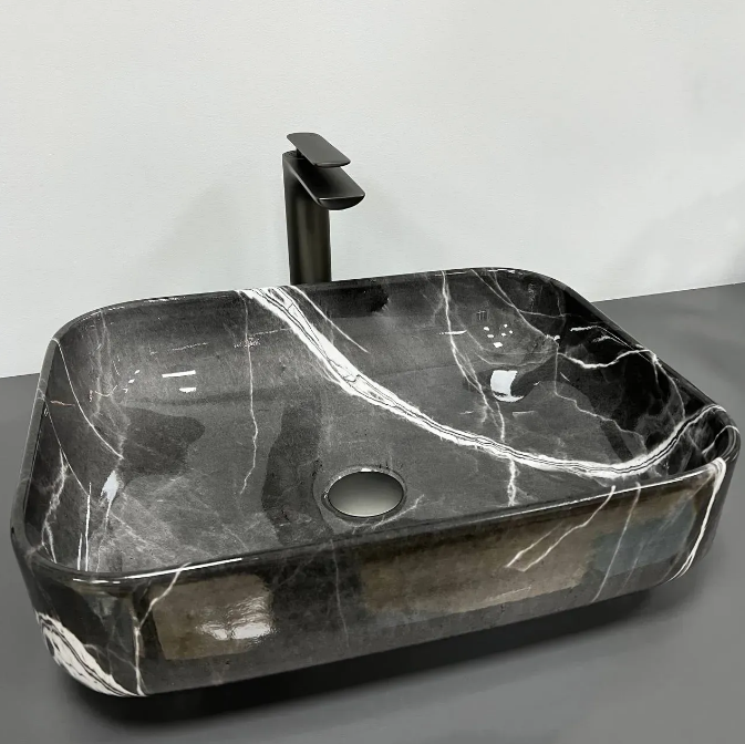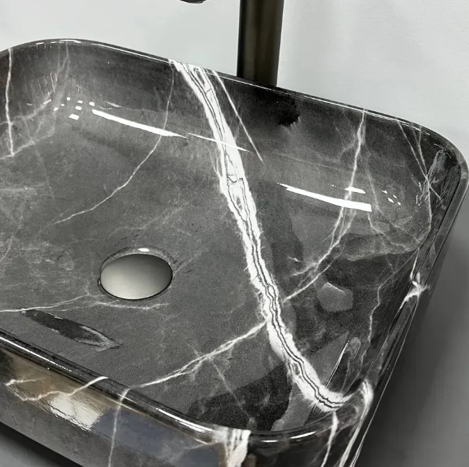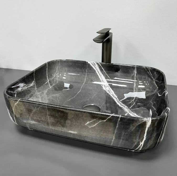 Накладные раковины серии VBI PALERMO пользуются высоким спросом и доступны в разных цветах в глянцевом исполнении. Классический дизайн с идеальной прямоугольной формой, смягчающийся скругленными углами и тонкими линиями. Модель VBI PALERMO DARK GRAY - имеет уникальный узор, в основе которого есть черный цвет, с блестящим глянцевым покрытием при свете.