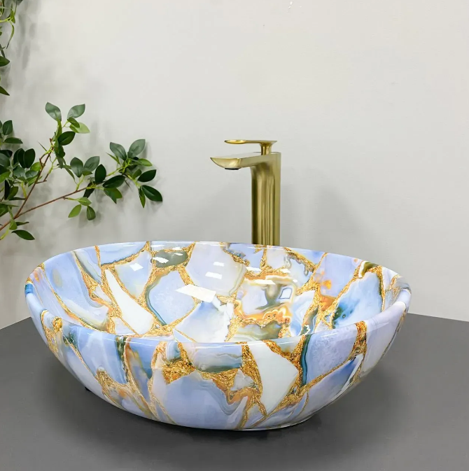 Накладные раковины серии VBI PARMA пользуются популярностью и предлагаются в разных цветах с глянцевым или матовым покрытием. Особенностью модели PARMA является широкий выбор узоров, имитирующих разные виды мрамора от нежных светлых оттенков до насыщенных зеленых и черных цветов, включая белоснежные глянцевые варианты.