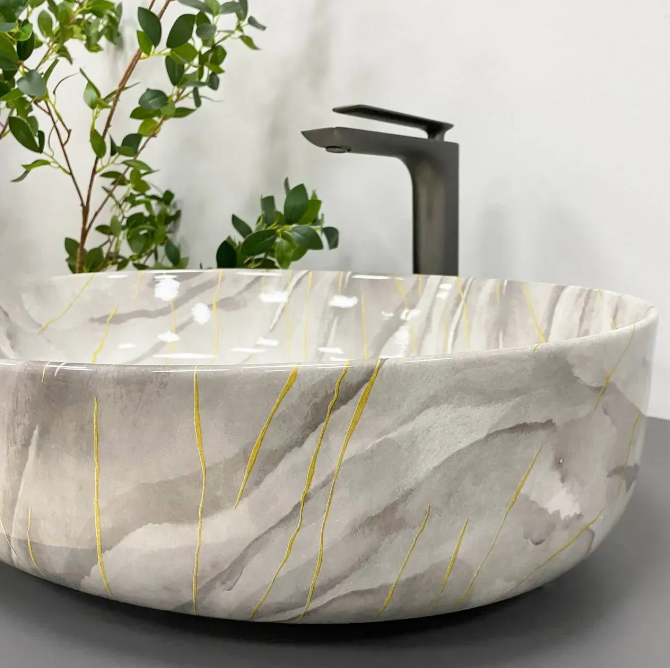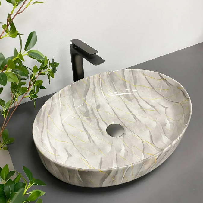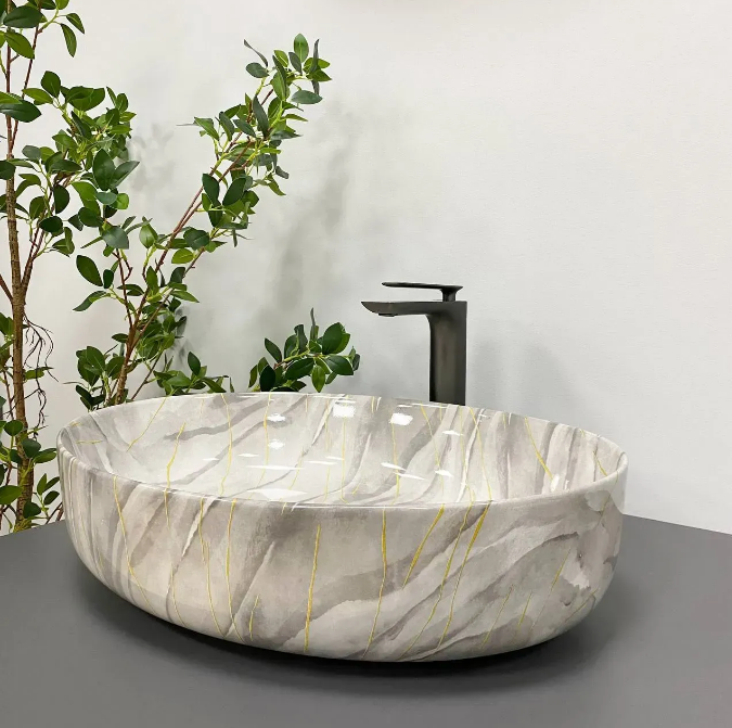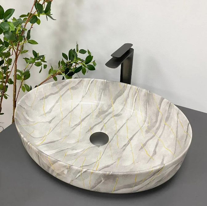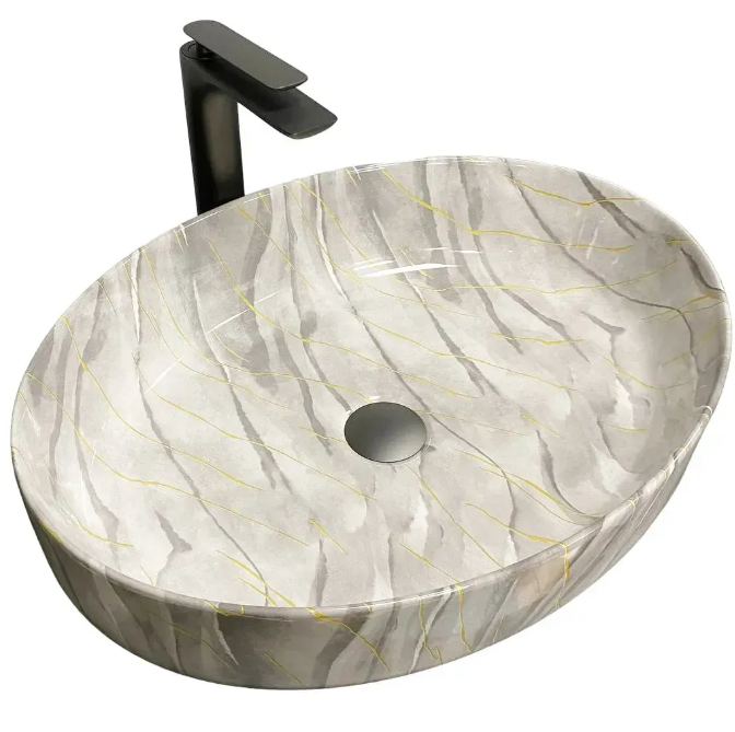 Накладные раковины серии VBI UDINE пользуются высоким спросом и доступны в разных цветах в глянцевом или матовом исполнении. Раковина поражает своими неповторимыми узорами и овальной формой с идеально изящными линиями. Накладная по способу упорядочения раковина, позволяет подобрать смеситель в любом стиле. Модель VBI UDINE STONE – имеет уникальный узор с глянцевым покрытием.