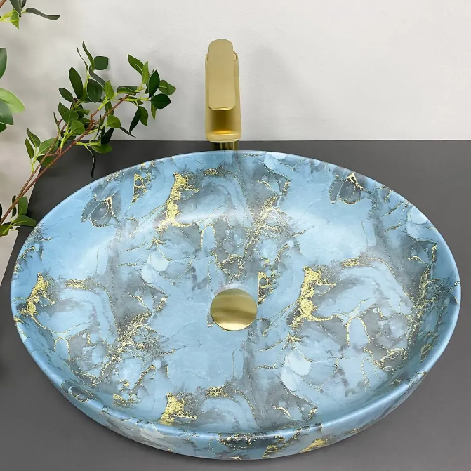Накладные раковины серии VBI UDINE пользуются высоким спросом и доступны в разных цветах в глянцевом или матовом исполнении. Раковина поражает своими неповторимыми узорами и овальной формой с идеально изящными линиями. Накладная по способу упорядочения раковина, позволяет подобрать смеситель в любом стиле. Модель VBI UDINE MARBLE BLUE - имеет уникальный узор, в основе которого насыщен голубой.