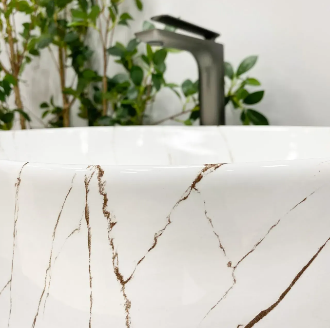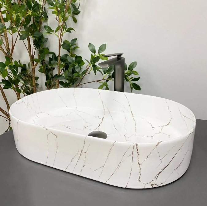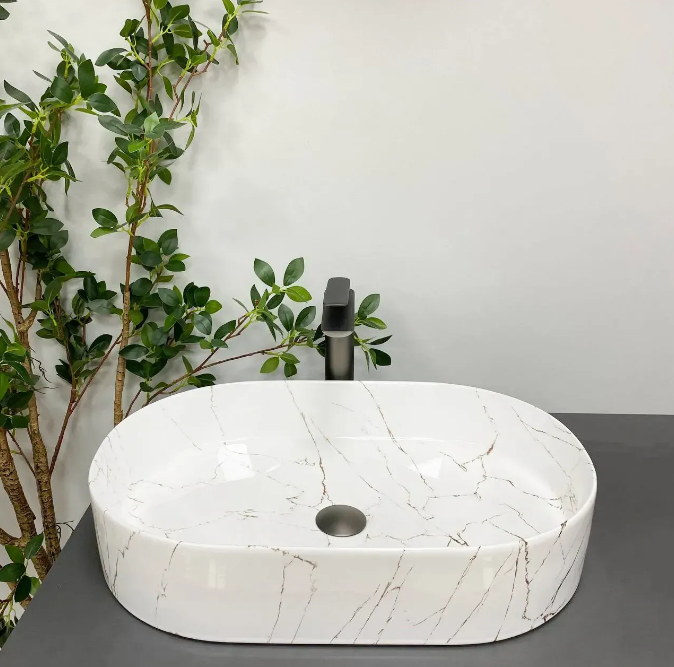 Накладные раковины серии VBI VERONA пользуются высоким спросом и доступны в разных размерах и цветах в глянцевом или матовом исполнении. Накладная, по способу установки раковина, имеет классическую овальную форму с четкими линиями. Это позволяет подобрать смеситель, как круглой, так и квадратной формы. Модель VBI VERONA 60 GOLD MARMO - имеет уникальный узор.
