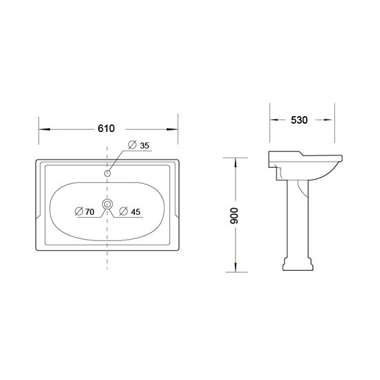 Габариты раковины (ВхШхГ) с пьедесталом: 92 x 63 x 55 см