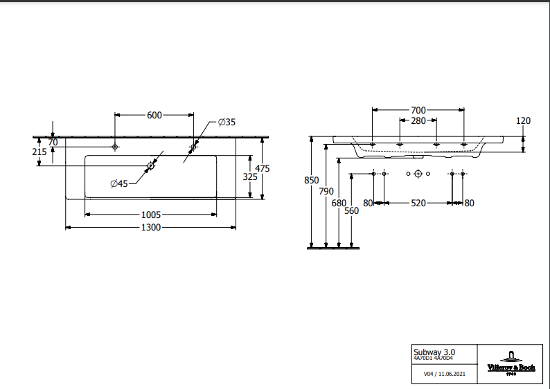 Раковина Villeroy & Boch Subway 3.0 130х47,5 см TitanCeram CeramicPlus альпийский белый 4A70D1R1