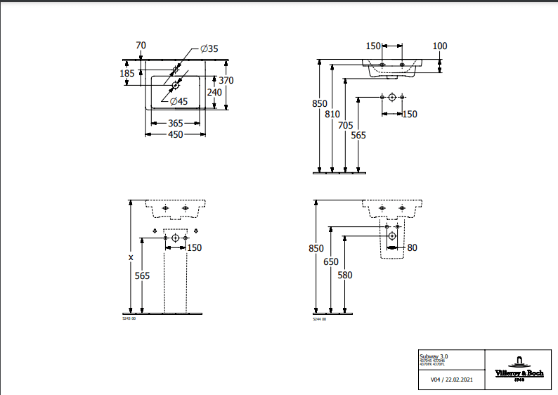 Раковина Villeroy & Boch Subway 3.0 45х37 см санитарная керамика альпийский белый 4370FK01