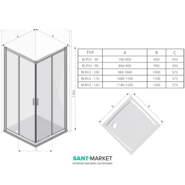 Размеры: 875-890x875-890x1900 мм, вход 500 мм