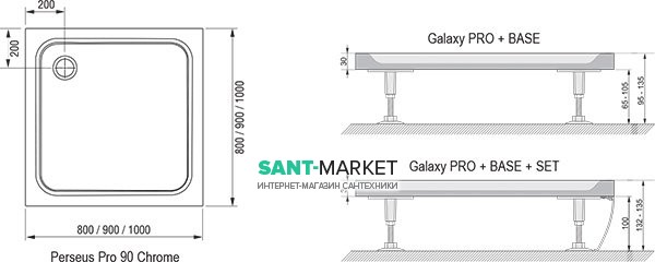 Поддоны можно установить на пол (бесступенчатое решение) или на облицованный пол. Также можно докупить ножки Base Galaxy Pro и переднюю панель с креплением — SET.