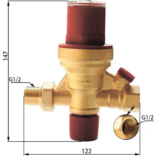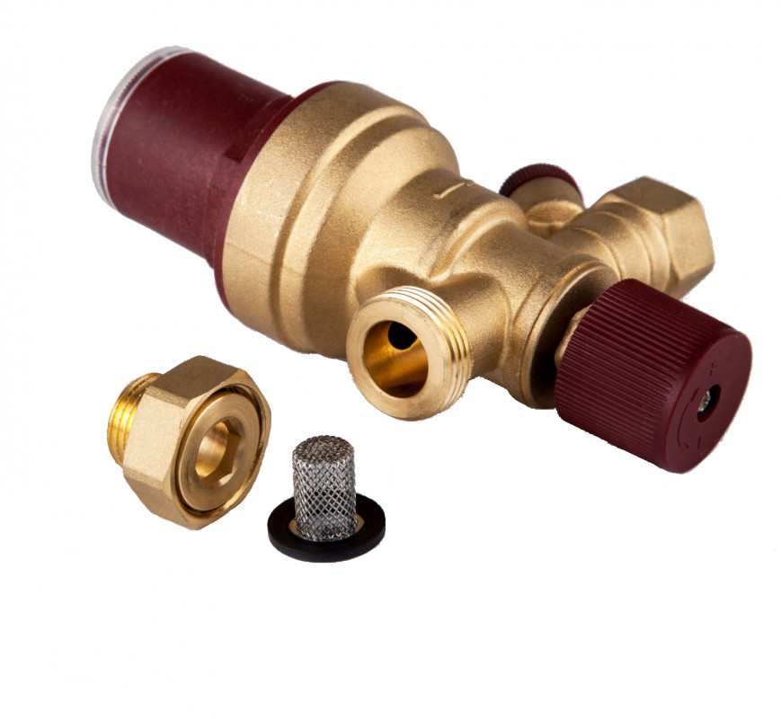 Регуляция выходного давления производится с помощью винта со шкалой, расположенной на верхней крышке. При повороте ручки в одну или другую сторону происходит увеличение или уменьшение исходного давления. Встроенный обратный клапан предотвращает обратный поток воды в случае перепада давления между подачей и обратным потоком. При помощи нижней ручки (запорного клапана) вы можете перекрыть подачу входной воды. Сетчатый фильтр предотвращает загрязнение мембраны.