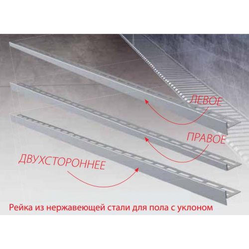 Направление наклона напольной плитки к водоотводящему желобу определяет вариант планки - правосторонняя или левосторонняя. Двухсторонний вариант можно использовать и как ограничитель для желоба и как наклонную планку.