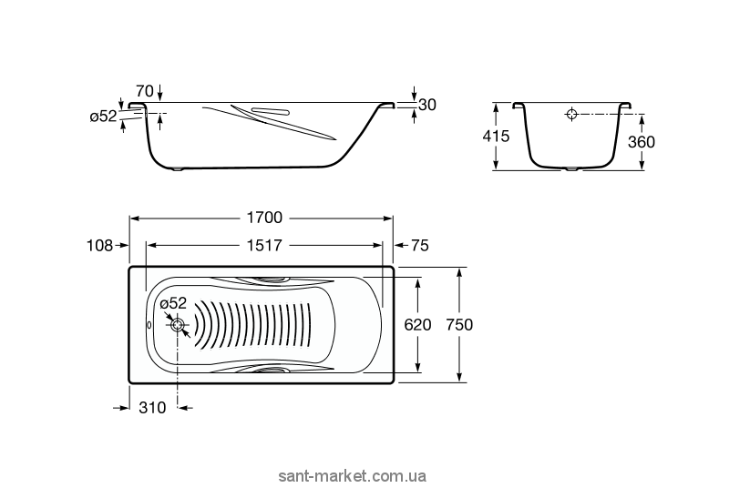Дно ванны достаточно широкое. От сливного отверствия полукругом нанесены специальные насечки, которые препятствуют скольжению и делают пребывание в ванной безопасным.