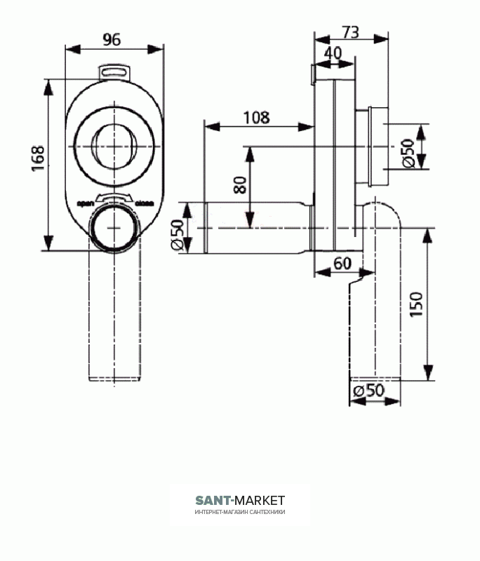 Отвод Ø 50 назад или вниз.