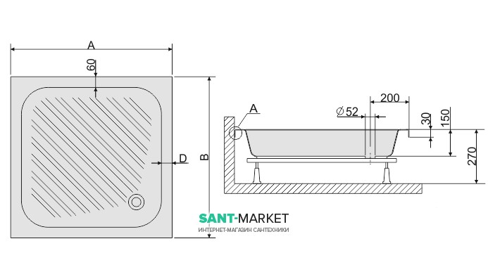 Квадратный поддон B/CL исполнен из санитарного акрила в комплекте со стеллажом.