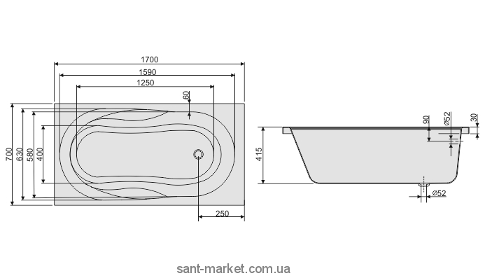 Ванна акриловая прямоугольная Sanplast коллекция Prestige 170х70х42 WP/AS + ST biew