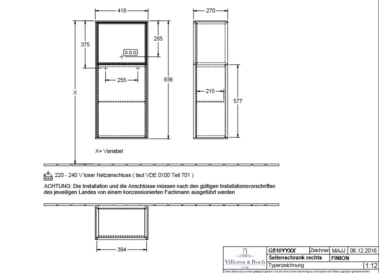 Шкафчик для ванной Villeroy & Boch Finion 41,8х93,6х27 см петли справа с подсветкой МДФ глянцевый черный лак/светло-серый матовый лак G510GJPH