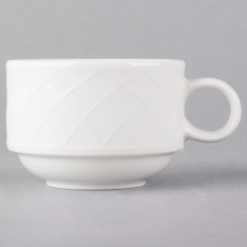 Этот предмет свежего белого цвета является профессиональным и привлекательным решением для сервировки вашего ресторана, отеля или обеденного зала загородного клуба. Его простой силуэт и цвет создают контраст, позволяя вашим ярким свежим блюдам стать центральным элементом любой обеденной зоны. Используйте эту штабелируемую чашку для подачи чая, кофе и горячего шоколада. Этот предмет украшен привлекательным перекрещивающимся узором, который обеспечивает тонкую и элегантную детализацию, добавляя визуального интереса к вашей настольной презентации. Подавайте его отдельно или сочетайте это изделие с остальной частью коллекции Bella для привлекательной и профессиональной презентации.