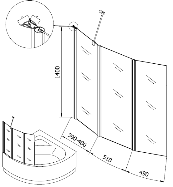 1) Шторка для ванны Kolpa San Loco Sole TP 143/K-D 143х140 см левая профиль серебряный стекло прозрачное
