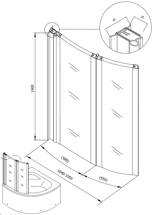 Складная двухстворчатая шторка Kolpa San Quat TP 105 для угловых ванн из полистирольного стекла. Возможность монтажа слева или справа.
