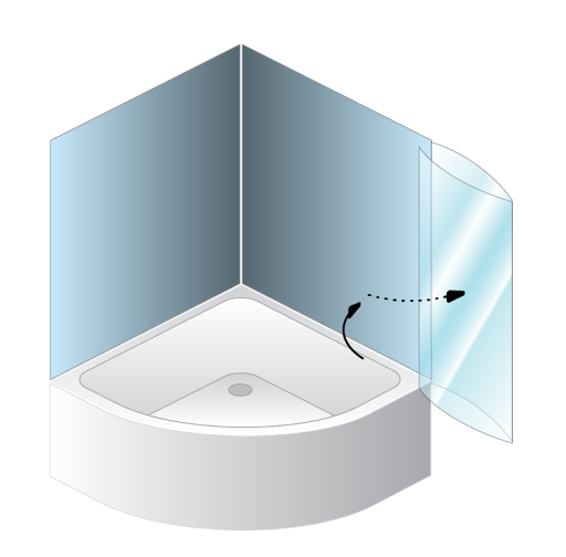 2x-секционный душевой заслон Kolpa San Sole Uni TP 104/K. Первая секция установлена на шарнирах, переключаемая на внешнюю сторону, обе секции складываются внутрь или наружу.