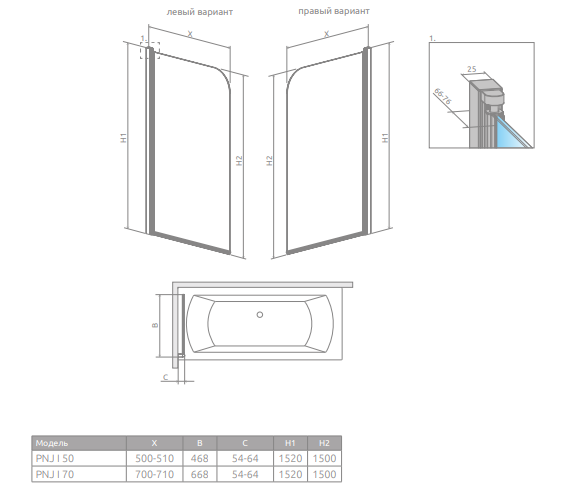 1) Шторка для ванны Radaway Eos PNJ I 50х152 см правая профиль хром стекло прозрачное