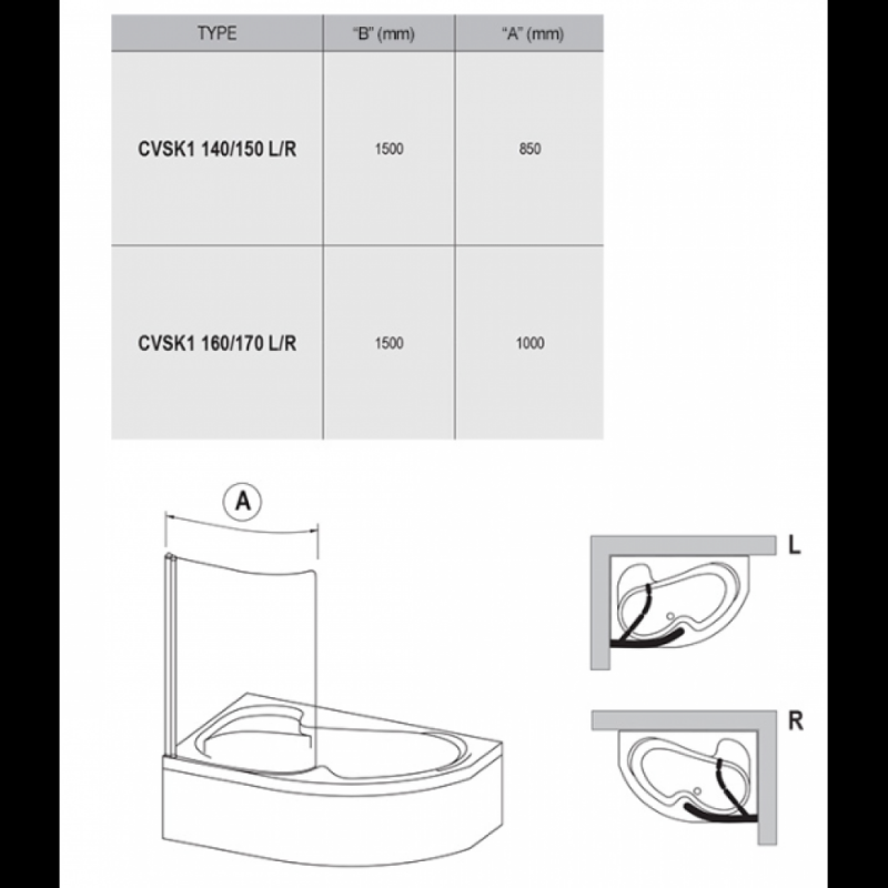 • ширина: 100 см для ванн 160, 170 см;