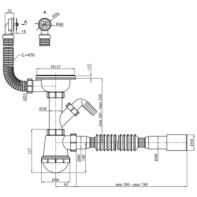 - Материал. Этот сифон изготовлен из высококачественного пластика с корзинчатым вентилем из нержавеющей стали. Это обеспечивает надежность и долговечность, а также устойчивость к коррозии.