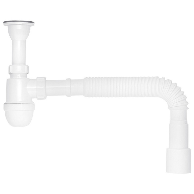 Сифон имеет бутылочный вид, что позволяет эффективно улавливать и задерживать осадки и мелкие частицы, предотвращая их попадание в канализационную систему и, следовательно, снижая риск засоров.