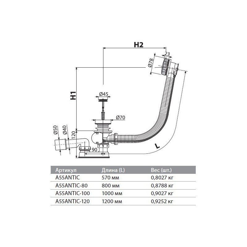 Сифон для ванны AlcaPlast автомат комплект бронза-антик A55ANTIC-100