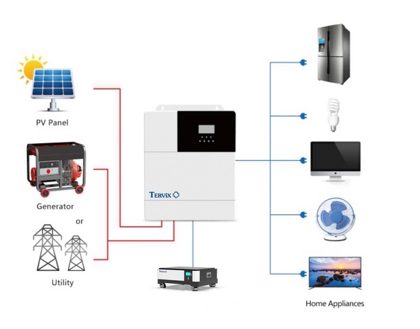 В качестве примера возьмем следующую систему – общая электросеть + Tervix BANKA Pro Line (10,2 кВтч) + солнечные панели + генератор.